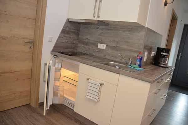- funktional ausgestattete Küche (Wohnküche) mit Kühlschrank und